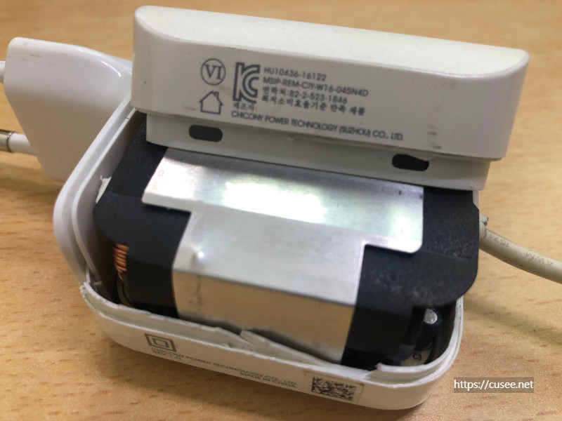 비록 접합면 경계부위는 일부 부셔졌지만, 어뎁터 뚜껑은 제거할 수 있다. 이번에 분해한 삼성노트북 어뎁터는 케이스 내부 부품을 보호하기 위한 장치도 되어 있다. 이 제품은 단선이 문제여서 분해했는데, 결국 제대로 연결해도 충전 전류가 충분히 나오지 않아, 내부 콘덴서와 트랜스 복합문제인 것으로 보여 수리는 포기했다.