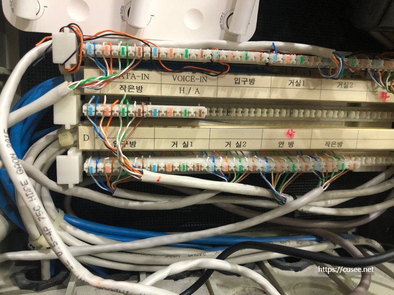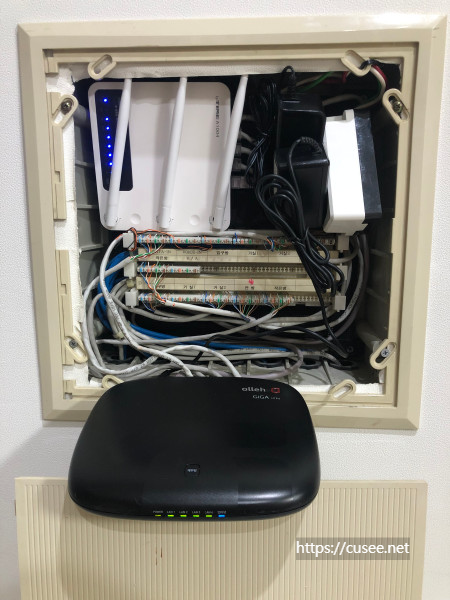 우리 집의 경우 모뎀(스위칭 허브 기능 포함)에서 나온 회선을 다시 공유기로 연결하여 각 방과 거실 포트로 분배해 주었다. 그러다 보니 세대통신단자함은 전원도 필요하고, 공간도 필요하다. 우리 집의 경우 겨우 선정리를 해서 빡빡하게 모뎀과 공유기를 넣었다.