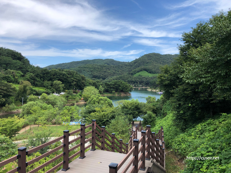 남쪽 전망대에서 시작하는 출렁다리는 호수 건너로 이어져 왼쪽 호수 둘레길을 걸을 수 있도록 산책로를 만들었고, 산책로를 따라 반시계 방향으로만 길이 만들어져 있다. 출렁다리를 건너기 전에는 오른쪽 산책로도 보여 이어지는 줄 알았지만, 아직 연결이 안 되어 있고, 작업이 남은 구간이 있다고 한다. 올해 세금을 들여 산책로 작업을 한다니 머지않아 양쪽으로 산책길이 이어질 것 같다.