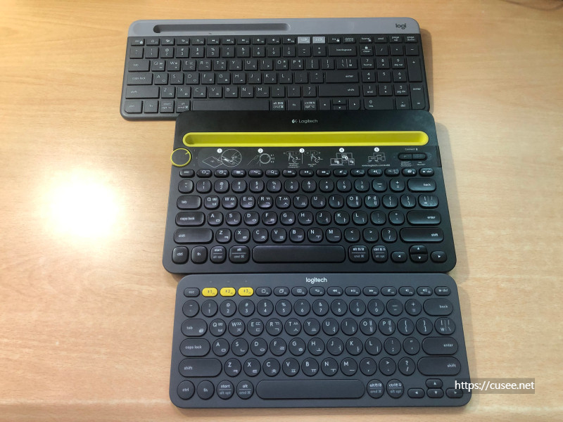 K380, K580, K580 크기 비교는 사진 한 장으로 설명 가능하다. 크기와 무게는 K480이 가장 크다. K580은 숫자패드가 있어서 좌우로 긴 것일 뿐 사실 숫자패드 부분을 제외하곤 세 제품의 키 크기는 거의 같다. 네모로 만들었는지 둥글게 만들었는지 차이뿐이다. 모두 79키 기반으로 만들어져 있다.