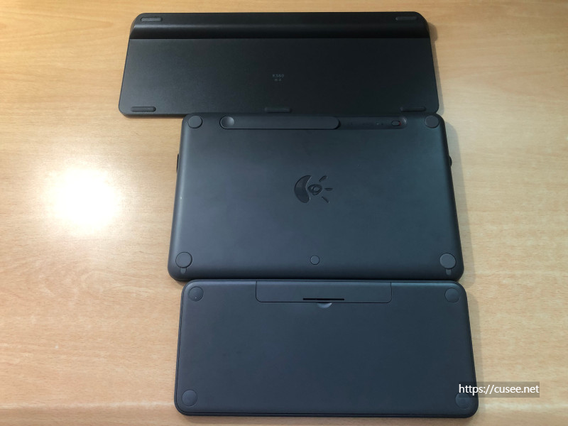 K380과 K480은 휴대성을 강조한 모델이다. 아무래도 태블릿과 스마트폰 연결을 주목적으로 만들다 보니 숫자패드를 생략했다. K480은 넓은 스마트 디바이스 거치 공간이 장점이라 할 수 있다. 휴대성을 강조했지만, K480은 K380에 비해 다소 투박한 디자인이 단점으로 꼽히는데, 당시 출시되던 태블릿의 두께를 생각한다면 이해도 될만하다. 반면 비교적 최근에 나온 K580의 거치 공간은 얇고, 좁아졌다.