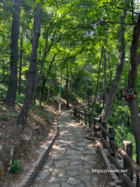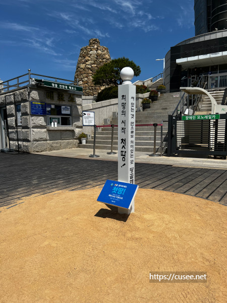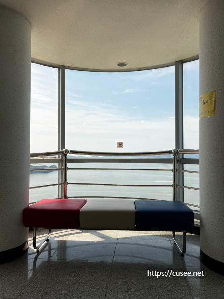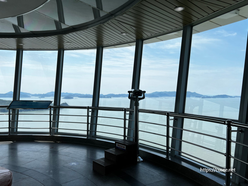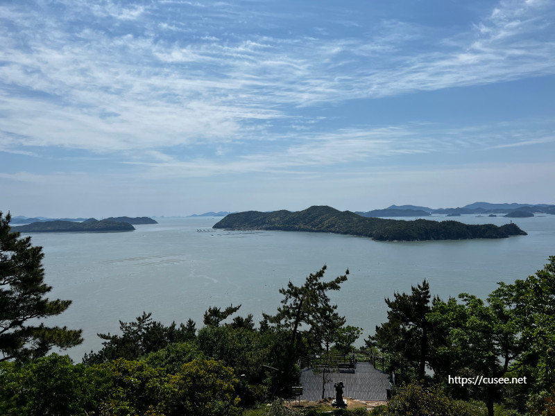 주차장에서 내려 약 10여분 걸어가면 전망대를 만날 수 있는데, 다른 산 정상에 오르는 것보다는 수월하지만 그래도 중간 중간 가쁜 숨을 잠시 진정시키며 올라갈 정도는 된다. 전망대로 오르는 길 오른쪽으로는 바다와 양식장이 보이고 그늘이어서 시원하고 풍광은 좋다.