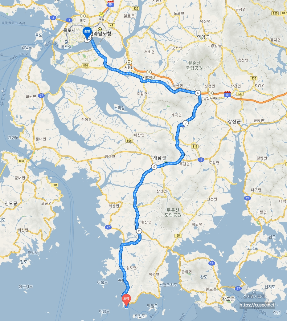여행 3일차 5.16(월) 아침이 밝았다. 간단히 준비해온 아침을 객실에서 해결하고 일찍 나섰다. 목포 평화광장 스타벅스는 9시부터 개점이어서 옆에 있는 이디야에서 커피 한잔을 사서 해남으로 이동했다. 네비게이션으로 목표지점을 잡고 출발. 89km 거리에 1시간 30분 소요된다고 나왔고, 실제 이동을 했을 때도 비슷한 시간에 도착했다.