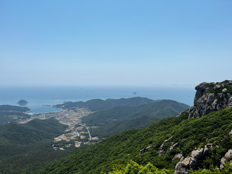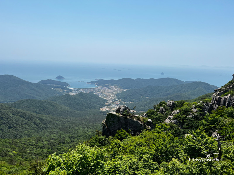 왼쪽 내륙 쪽으로는 높고 낮은 봉우리들이 보이는데, 하동, 사천 쪽이 보인다. 오른쪽은 광양이 바로 보인다.