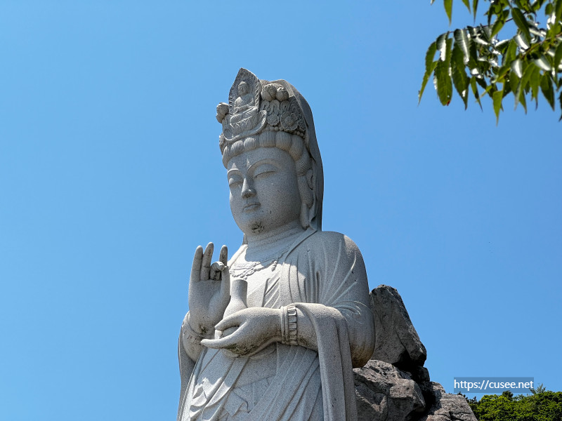 해수관음상(해수관세음보살상)은 연화대 위해 왼손에 약병을 들고 남해를 바라보고 있다. 아마도 이곳의 기도는 아픈 사람을 낫게 해 달라는 바람이 간절한 것이 아닐까. 1991년 한 기업가의 후원으로 세워졌으며, 육로 운반이 여의치 않아 헬기를 이용해 탑대(연화대)에 안치했다고 한다.