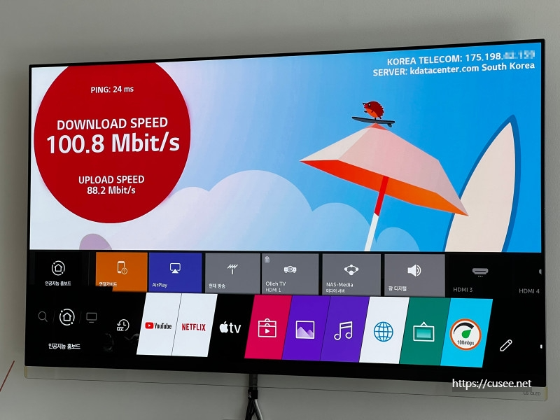 LG OLED TV의 유선은 100Mbps 까지 지원하여 다소 아쉬운 부분이 있으나, T5008에 연결하여 사용할 때는 충분한 대역폭을 보장해 준다. TV를 통해서는 유튜브, 넷플릭스, NAS 접속 등을 통해 콘텐츠를 즐기기 때문에 100Mbps로 어뎁터가 구성되어 있는 것 같다. 그러나, NAS 연결 등을 고려하면 최소 Gigabit 어뎁터로 업그레이드해야 할 것 같다. 부품값도 차이 거의 없는데 말이다.