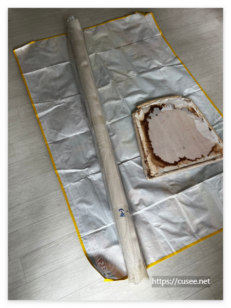 연필과 자를 이용하여 50cm x 50cm로 자르는데, 이번에 주문한 곳에서는 200cm가 아닌 220cm를 보내와서 4조각으로 자르니 55cm x 50cm(길이x 폭)로 자를 수 있었다. 남은 220cm x 87cm(길이 x 폭)은 다음에 사용하기 위해 따로 조심스럽게 재포장을 해서 보관했다.