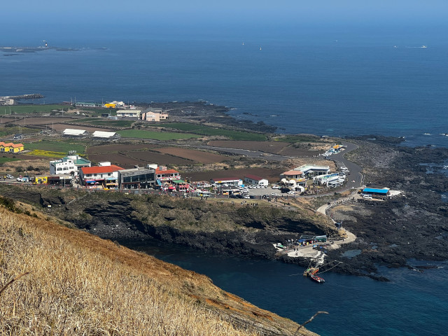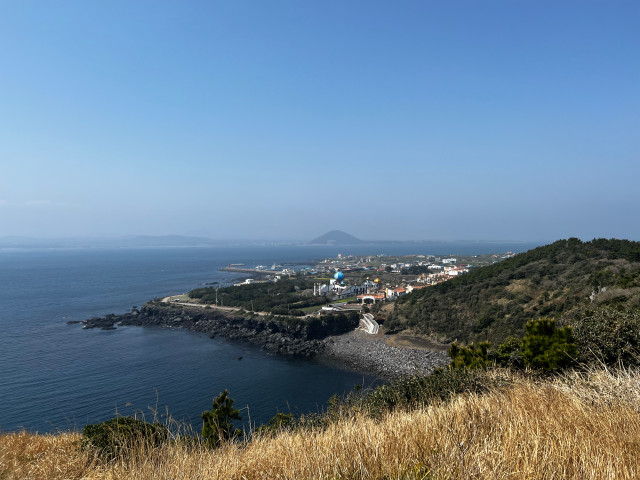 봉우리에서 우도를 바라본 풍경. 저 멀리 민가들도 보이고, 천진항도 보인다. 이제 곧 방문할 검멀레해변은 우도봉의 동쪽 바닷가로 바로 뒤쪽 해식애절벽이 멋진 풍광을 가진 곳이다.