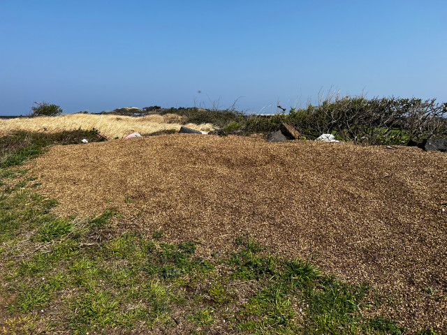 우도 하면 땅콩이 유명한데, 다른 지역 땅콩보다 고소하고 크기도 큰 것 같았다. 땅콩마을은 동쪽 비양도 아래 있긴 하지만, 땅콩이야 우도 전체 어디서든 수확을 하는 것 같았다. 얼마나 땅콩을 먹었으면, 껍질로 산을 만들어 놓은 곳을 지나가기도 했다. 지난번 가파도 때는 소라껍데기가 지천에 널려 있는 것을 보고 놀랐는데, 우도는 땅콩껍질...