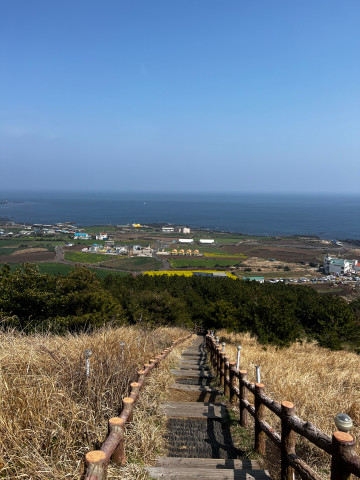 내려가는 길은 다소 가파롭게 보인다. 반대로, 검멀레해변에서 우도봉으로 올라오기엔 다소 힘들 수 있겠다는 생각이다. 완만한 천진항-우도봉 코스에 비해 경사가 급하다. 내려가는 사람은 콧바람에 상쾌하게 내려갈 수 있지만...