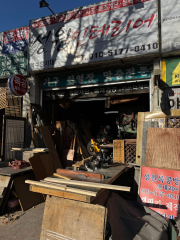 그중 한 가게(오래된 노포)에 부러진 팔걸이를 보여주며 만들어줄 수 있겠느냐 물었는데, 무뚝뚝한 사장님(할아버지)은 아무 말 없이 가게 내에 돌아다니는 비슷한 크기의 재료를 찾기 시작했다. 가져온 팔걸이 재료 치수를 재고 이리저리 보시더니, 똑같은 나무는 없고, 보통 미송(미국산 소나무)이 가장 많으니 미송으로 만들어줘도 되냐 물으셨고, 바로 만들어 달라 부탁드렸다. 사실 이 가게에 들른 것은 가게 오른쪽에 '캠핑카 제작'이라는 광고를 보고 들어간 곳이었다.