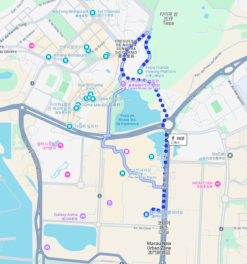 아직 해는 길어서 어둡지는 않았으나 여행 1일차 목표였던 타이파 마을로 가려고 나섰다. 사전 확인한 정보로는, 걸어갈 수 있다는 의견도, 버스를 타고 갈 수도 있다는 정보도 있었지만, 지도에서 거리를 측정해보니 호텔에서 2~3km 정도 거리에 방문 목적지가 있었다. 평소 걷기를 좋아하는 우리는 그냥 걸어가기로 했다.