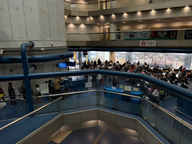 홍콩 입국장으로 이동하기 위해 에스컬레이터를 계속 타고 올라가는 중에 본 모습. 이 아침에 마카오에서 홍콩 가는 사람보다 홍콩에서 마카오 가는 사람이 훨씬 많아 보였다. 홍콩여행 중 당일치기로 마카오 가는 사람이 더 많을 테니까.