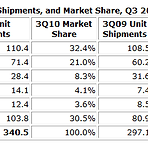 IDC는 미국 현지 시각으로 10월 28일 보도자료를 통해 Apple이 3분기 세계 휴대폰 단말기 시장 4위에 올랐다고 밝혔다. 스마트폰만 생산하는 제조사로서는 BlackBerry의 RIM을 제치고 1위에 오른 것이다. 2010년 3분기 세계 휴대폰 시장은 전년도 대비 14.6% 성장한 3억 4,050만 대로 집계되었다. 2009년 3분기에는 2억 9,710만 대를 출하했는데, 두 자리 수 이상 성장한 것이다. 3분기 동안 Apple은 1,410만 대를 출하하여 1,240만 대를 출하한 RIM을 앞질렀다. 전년 동기에 740만 대의 iPhone을 출하했기에 1년만에 약 90.5%라는 놀라운 증가율을 기록했다. 물량면에서 LG전자 출하량의 거의 절반 수준으로 올랐다. RIM도 1,240만 대로 저년 850..