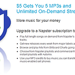 작년 9월 Best Buy의 품에 안긴 Napster가 월 5 달러짜리 무제한 MP3 스트리밍 서비스를 내놓았다. 바뀌기전 무제한 스트리밍 서비스 요금은 월 12.95 달러였으니 50% 이하로 가격을 낮춘 셈이다. 스트리밍 뿐만 아니라 한달에 5곡 까지는 다운로드도 가능하다. 다운로드한 음악은 PC와 iPod을 비롯한 MP3P에 재생이 가능하다. 스트리밍 서비스의 경우 한달내에는 원하는 곡의 전체를 3번까지 들을 수 있게 제공한다. 월 5 달러에 5곡 다운로드가 가능하므로 곡당 1달러 수준이며, 신곡과 오래된 음악에 대한 구분을 두지 않는다는 점에서는 Apple의 iTunes와는 비교가 된다. iTunes의 경우 인기곡과 신곡은 1.29 달러를 받고 있다. 이번 요금제는 다분히 iTunes를 겨냥한 것..