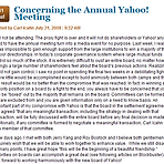 말 많았던 Yahoo의 연례 주총이 하루 앞으로 다가왔다. 이미 현재 한국은 8월 1일이 시작되었지만, 미국은 현재 7월 31일이다. 현지시각으로 8월 1일 금요일 Yahoo의 주총이 우여곡절 끝에 열리게 되었다. 지난주 현 Yahoo 이사진과 Carl Icahn은 Icahn을 포함한 3명을 이사회 멤버로 선임하기로 하면서 양측이 벌일 예정이었던 주총에서의 위임장 대결을 피하게 되었다. Carl Icahn은 현 Yahoo의 Jerry Yang을 포함한 이사진을 축출하고 주주들과 자신이 지지하는 새로운 이사진을 이사회에 진출시키겠다고 호언장담했었다. Microsoft와의 합병을 반대하는 현 이사진에 대한 불신임을 주총에서 확인하겠다는 것이 큰 이유였다. 그러나 지난 22일, 자신을 포함한 이사진 3명이 새..